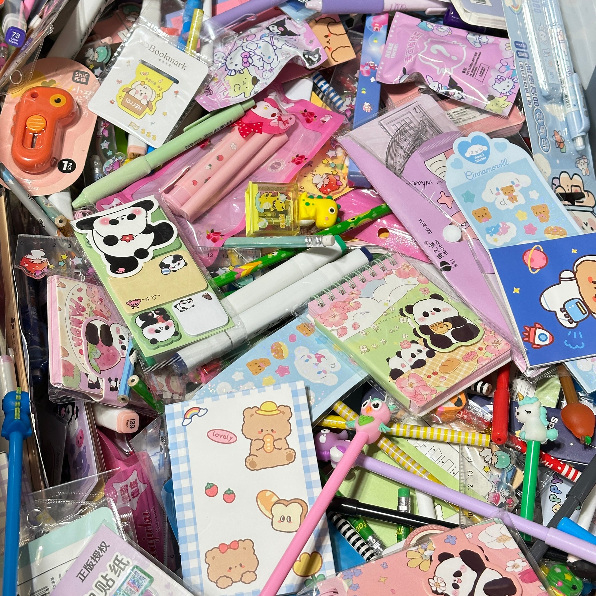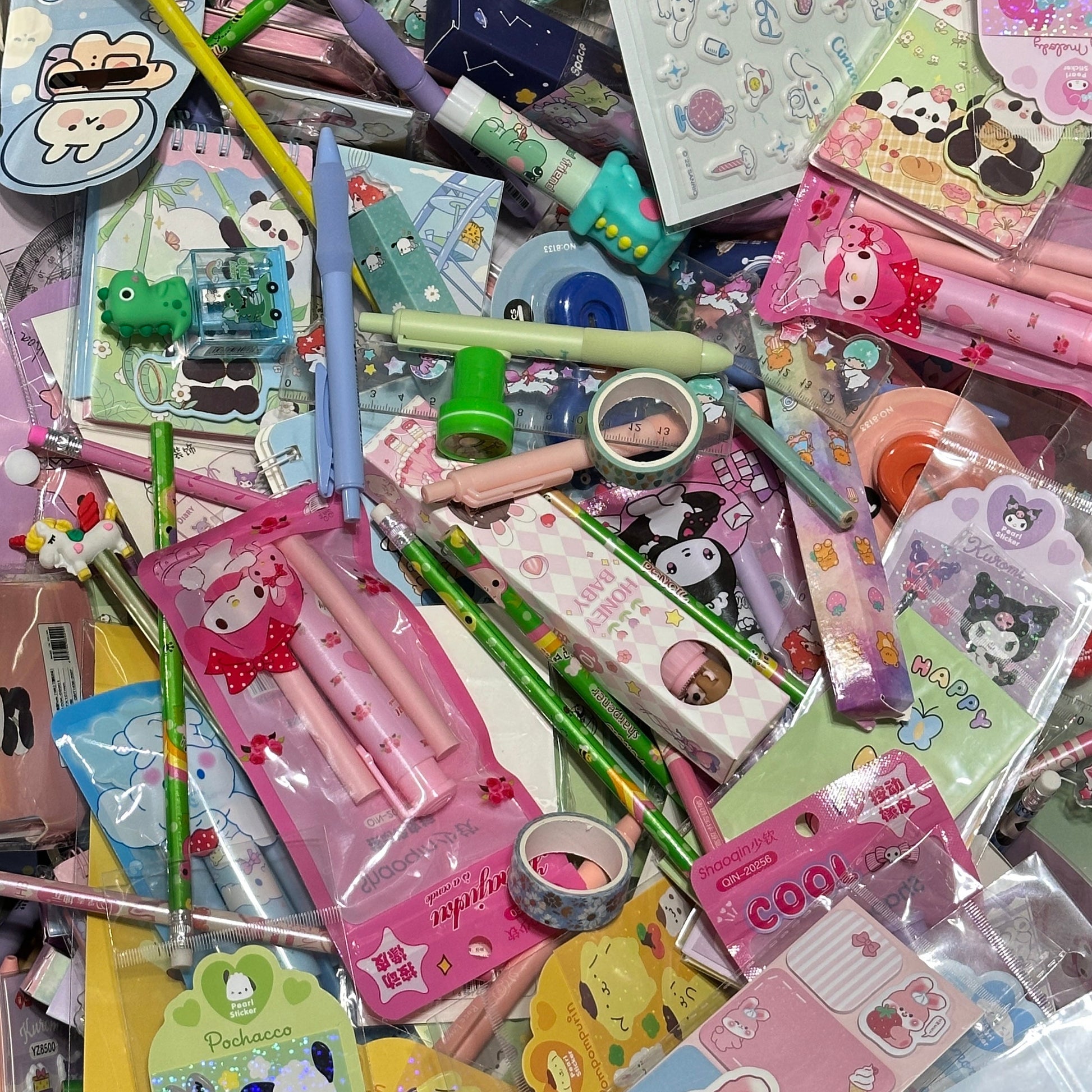 Items in the scoop may include : pens, pencils, sharpeners, erasers, rulers, correction tapes, washi tapes, stickers, notebooks, sticky note pads, memo pads, paper clips, hole punchers, stamps, box cutters etc.,